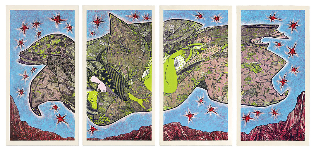 In his ongoing series of prints titled “Dream,” Endi Poskovic (IG: @endiposkovic) explores the boundaries of print media via the expanded process of visualization, art making, and storytelling. The artist integrates analog and digital drawing to produce large-scale laser-engraved and hand-carved woodcuts. Implementing a shallow rubbing method reminiscent of Japanese water printing, Poskovic explores nuanced ways of carving and printing his block plates. Thematically, Dream investigates the nature of composite narratives in which real and imagined visual signifiers intersect to create images reflecting personal history and larger social and cultural narratives.