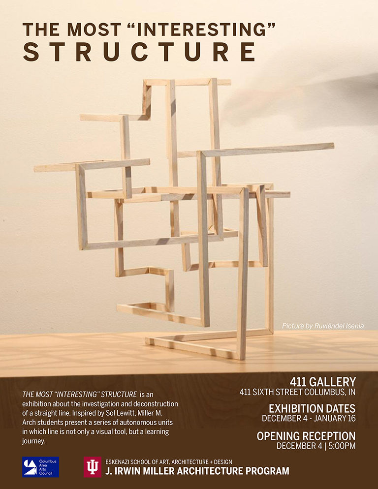 The Most “Interesting” Structure is an exhibition about the investigation and deconstruction of a straight line. Inspired by Sol Lewitt, M.Arch students in the Eskenazi School's J. Irwin Miller Architecture Program present a series of autonomous units in which line is not only a visual tool, but a learning journey.