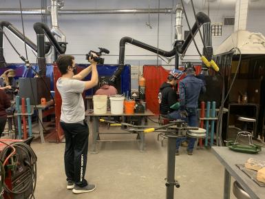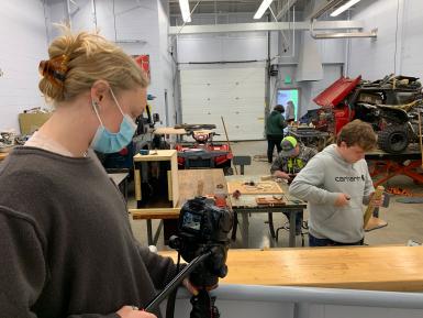Fourth-graders across the Monroe County Community School Corporation competed in the MyMachine Challenge, which asked students to invent a “dream machine” and create a prototype. Students in Eskenazi School of Art, Architecture + Design senior lecturer Jon Racek’s Intensive Seminar in Comprehensive Design class refined four of the designs and created more sophisticated prototypes, and Hoosier Hills Career Center students built the machines. Students in senior lecturer Susanne Schwibs’ Advanced Documentary Production Workshop created documentaries about the projects.