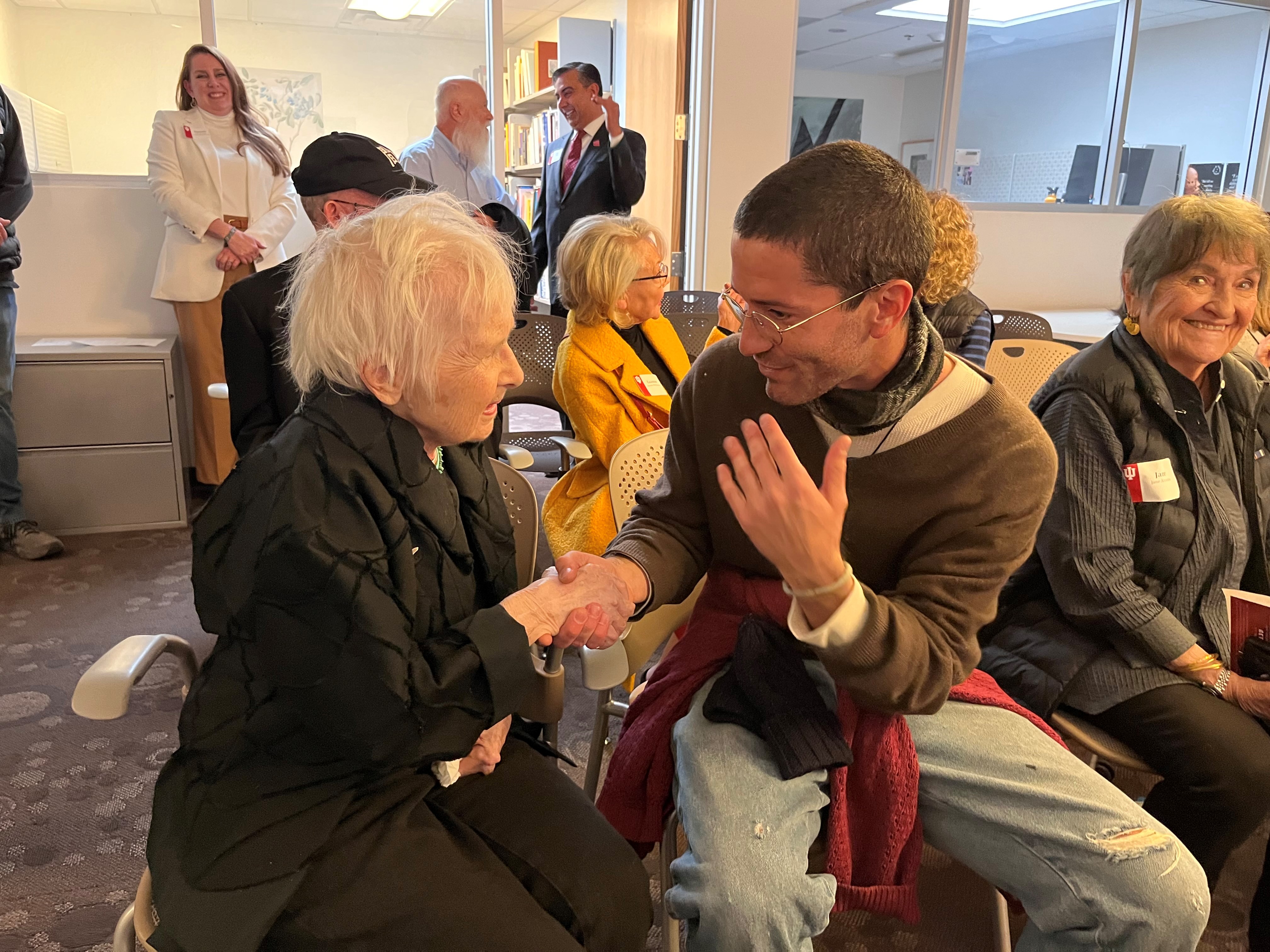 Eskenazi alum Andrés Mario de Varona (BFA ’19) visits with Betty Hahn at the November 17 ceremony.Osamu James Nakagawa