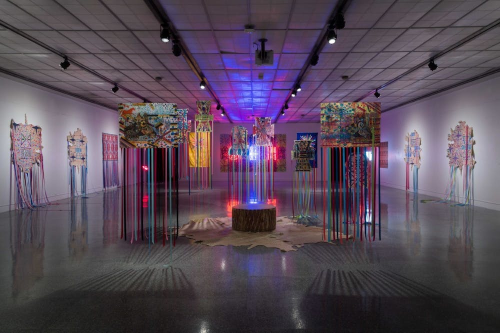 The gallery spotlights pieces such as neon sculptures, prints, audio, video and fabric work, alongside other objects that discuss themes of Indigenous identity and Native narratives.