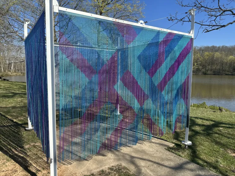 Designed by Rachel Staley and Kayley Adams, “A Common Link” is inspired by Salem’s quilting heritage, featuring brightly colored patterns across metal link drapery that complements the beauty of Lake Salinda’s scenery.