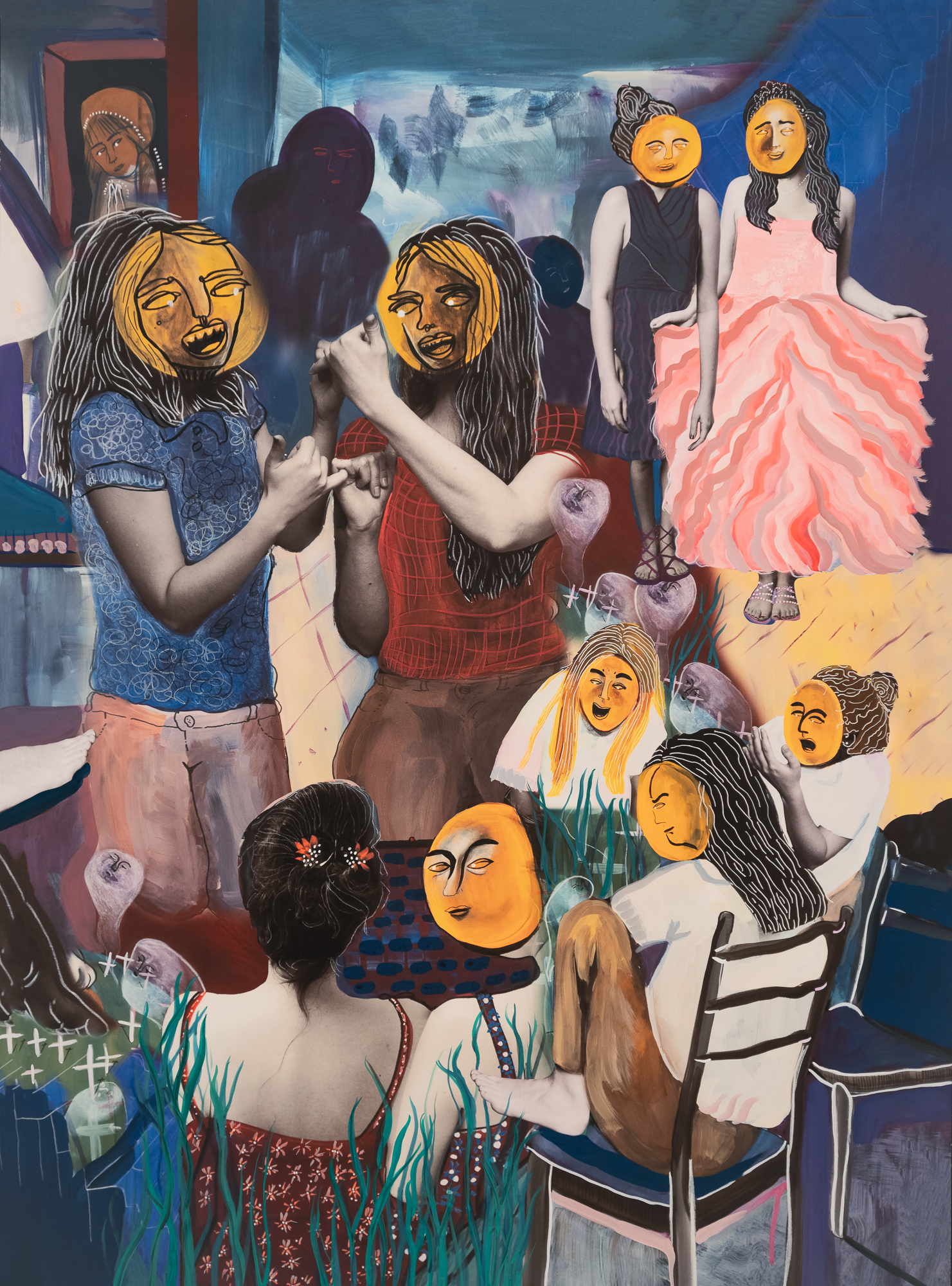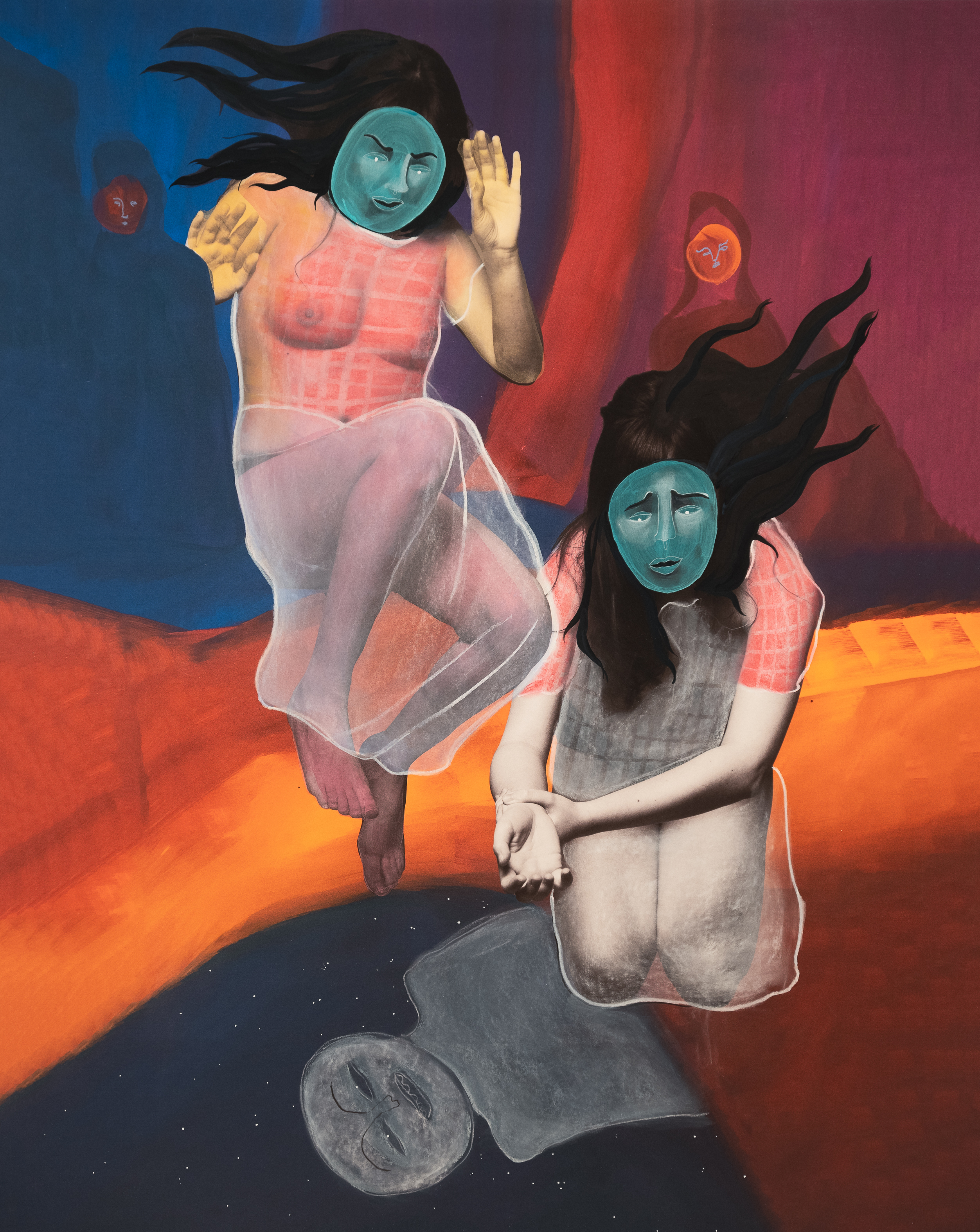 LG: The figures in Next to Myself are all self-portraits (except a few where before the covid shutdown I had my friend help as a model). I began by thinking about the different experiences I’ve had throughout my life and how the person I was at that time has made up who I am today. These are the “layers of the self” or from the title “layers of the Latinx Female Experience and Body” because as I take a look at what formed the layers of who I am, many of these experiences, dreams, memories, and feelings stem from growing up in a bicultural household. Through self-portraiture, which is the base of each piece, I am able to imagine what the different parts of myself would look like if they were to interact in the same space.
