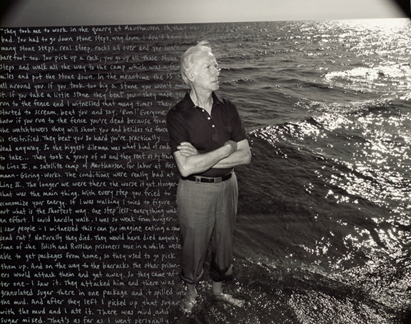 In 1988, I made a photograph with an inscribed text of Mišo Vogel, an Auschwitz survivor living in Indiana. For the narrative, I used notes I had taken while talking with him during our portrait session. I wanted to show his tattoo, which is in and of itself a powerful visual statement about the brutality of the German war against the Jews. I also asked him to hold a photograph of his father who died in Auschwitz. This image acted as a window, and Mišo closed his eyes, put his hand over his heart, and was, for a moment, transported back to a painful time in his past.During my year off from teaching as a Guggenheim Fellow (1991–92), I decided to build a series of images around the photograph of Mišo. I began each session by videotaping each survivor’s story prior to making portraits with my still camera. Instead of rewriting accounts of the survivors in my own words, I began to excerpt whole chunks of the testimonies verbatim, letting the individuals speak for themselves. I tried to keep the “flavor” of the European accents, which often reminded me of my own grandparents, who emigrated to the United States from Eastern Europe at the turn of the twentieth century. I looked for small, intimate details in the survivors’ narratives rather than grander, more generic experiences, or statistical data, and aimed to match these with visual elements in their environments that resonated with their stories of survival.