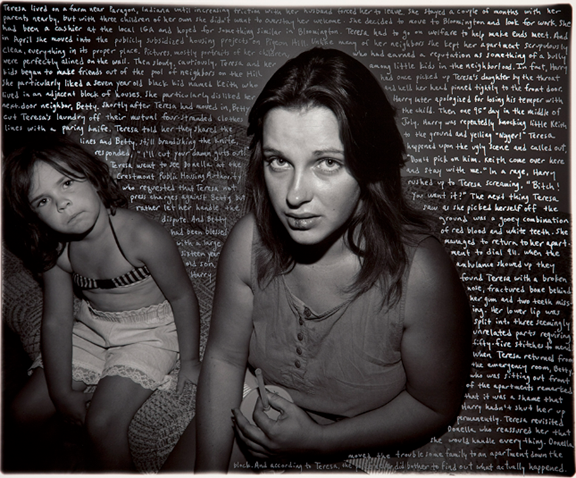 So that is how my work changed after I came to teach—I started combining images and text. I love teaching; I love the enterprise; I love working with my students. When they do well I couldn’t be prouder and happier. But if I’m not doing my work, and making new discoveries for me, if I’m not pushing myself, if I’m not learning new things about photography and about my own work and what it means to be an artist, I can’t be a good teacher. That’s why IU was such a good place for me—it’s a research university. There’s money for your research; they’ll set your studio up; get you the equipment you need; encourage you to travel. As long as you succeed they will help you get to the next level. That is something I have really loved about being here.