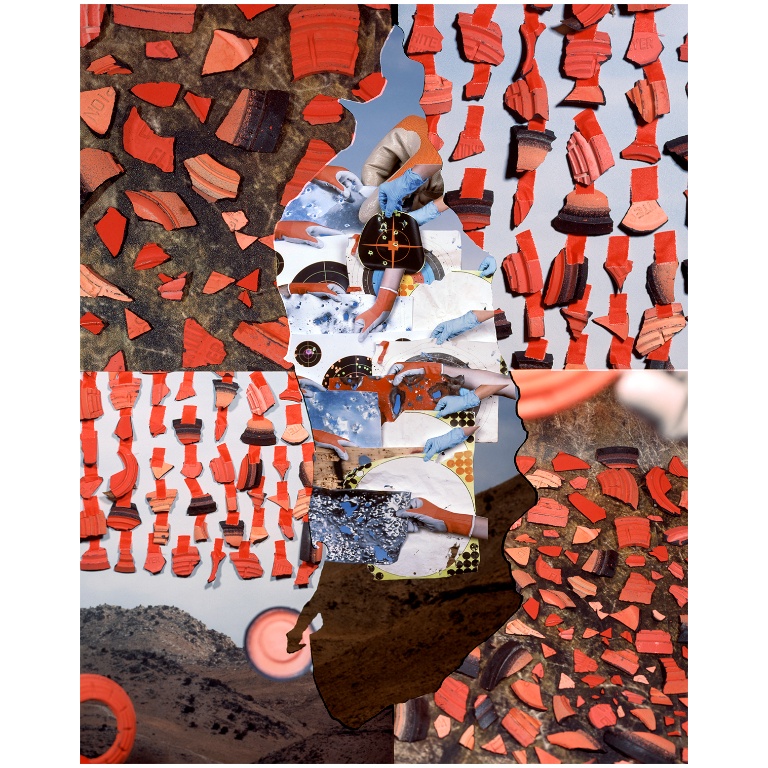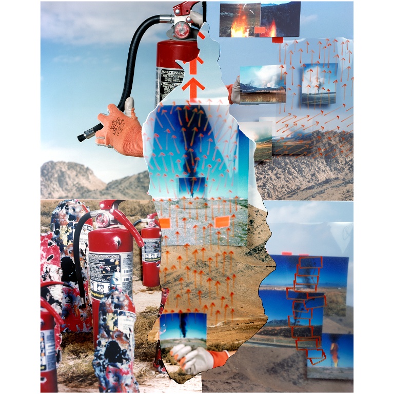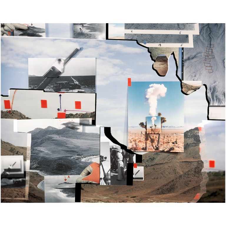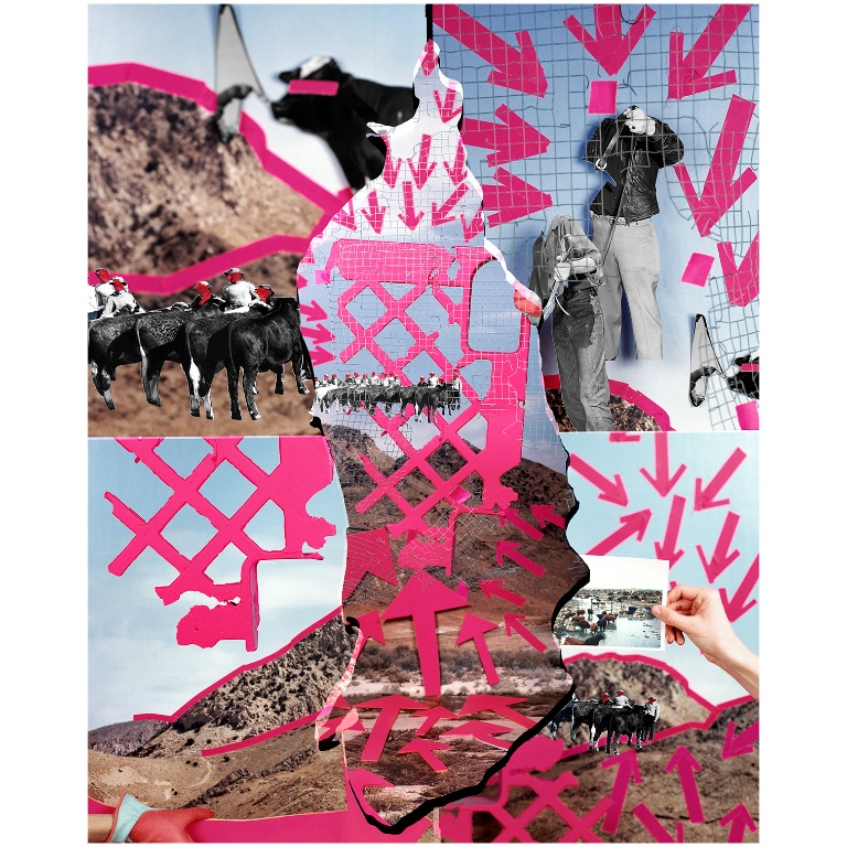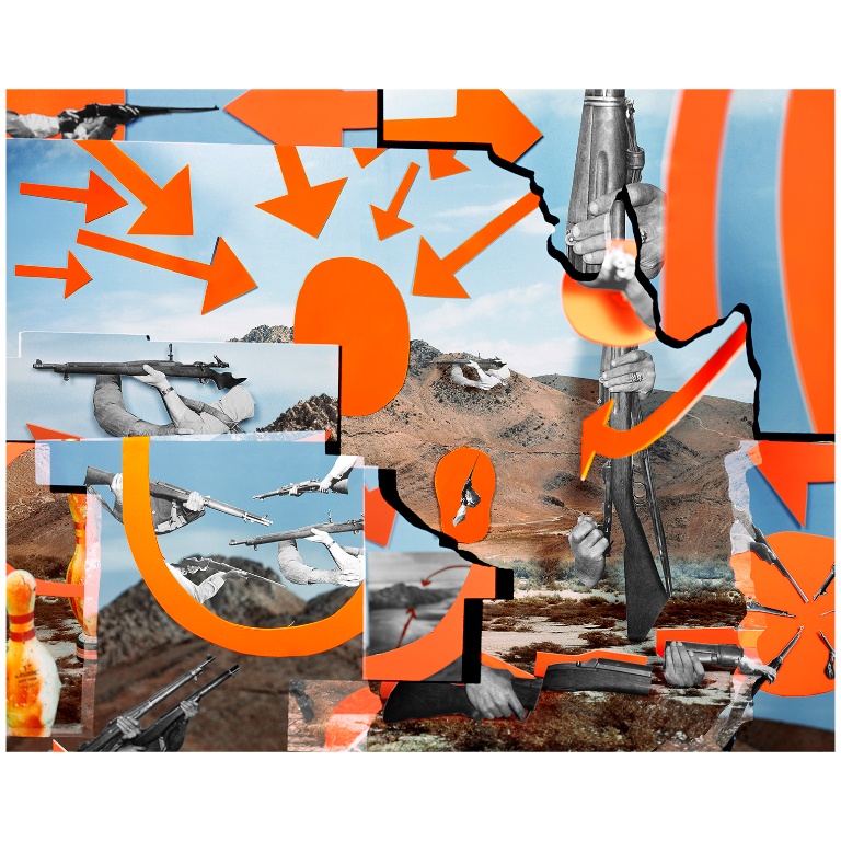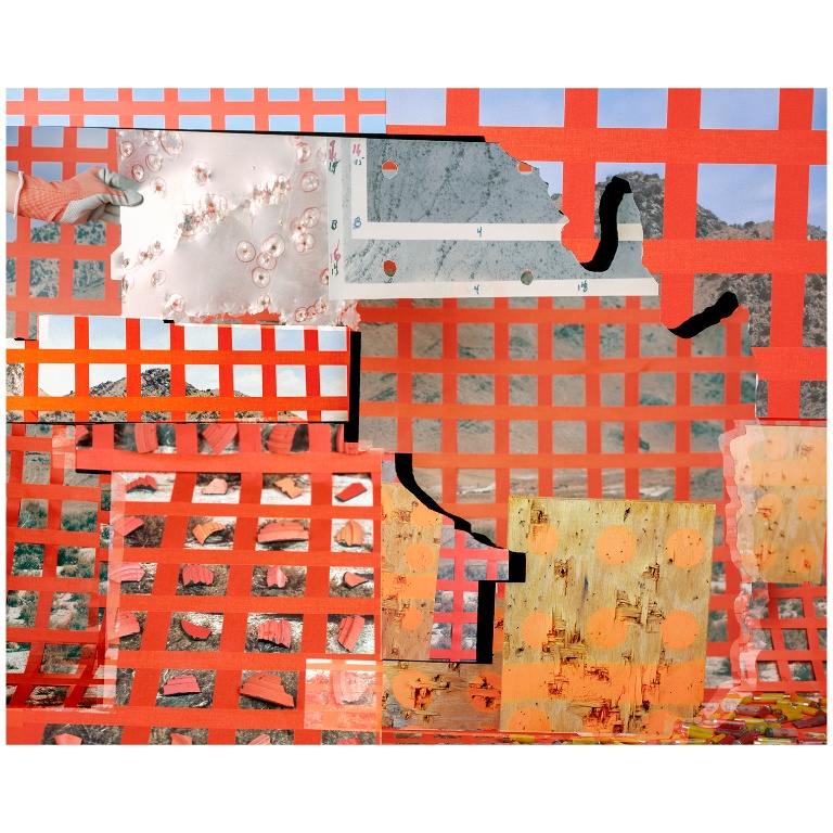 Disruption is everywhere in Jaclyn Wright’s assemblages. Blaze orange, the eyeball searing color meant to snap us to attention, blasts through Wright’s multi-dimensional observations on the disturbed landscape of western Utah, where she resides. Her marked-up collages feel like a sport playbook—arrows and grids expose hidden strategies on land long-considered a playing field. The shape of the shrinking Salt Lake recurs, the environmental price of Western progress. Wright’s work plays in the wreckage of exploitative histories—from ranching to weapons testing to the bullet riddled targets left in the disregarded desert.