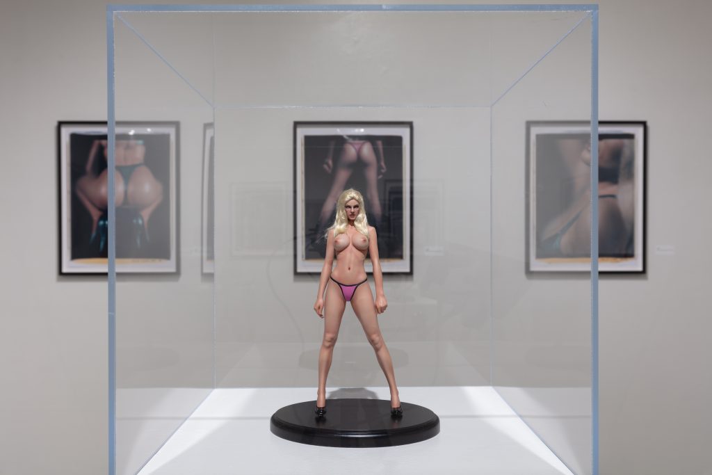 A while back Levinthal was working for a jewelry company on a campaign about the idea of fantasy. He went to many miniature trade shows to search for inspiration. At the shows he noticed that there was always an “adult” section with sexually explicit material: figurines in nude or sexually charged poses. In these sections, a popular item for purchase is an unpainted model kit. In a kit, a figurine that’s essentially the “skin” of a nude, usually female, figure can be painted or made up to the purchaser’s specifications. Levinthal began to obtain these kits, which he then brought to various craftspeople to paint and complete. Yet he noticed that when the dolls were returned to him, none looked the same. Some were blondes, brunettes, redheads; some were fair-skinned, some had deeper complexions; some had pubic hair, some were waxed; some were trussed in bondage gear, some were holding flowers in sticky, hyper-feminine lingerie.