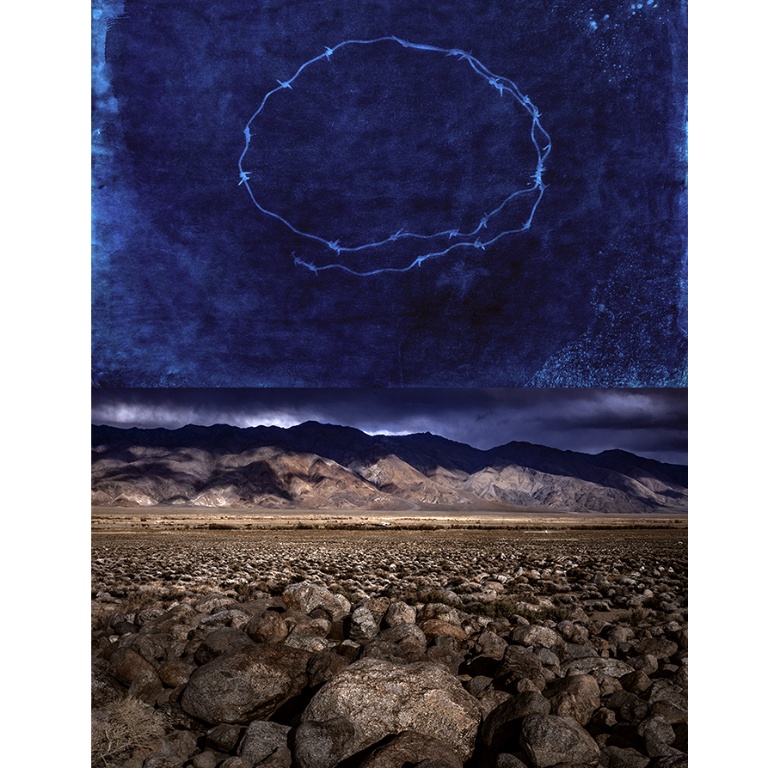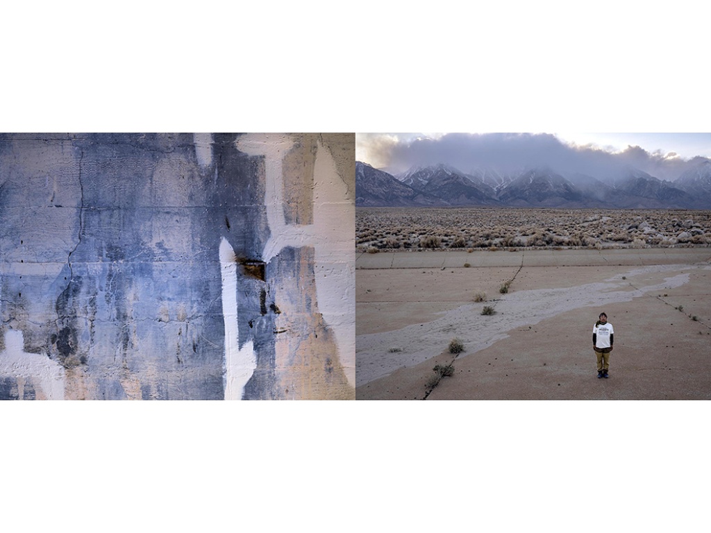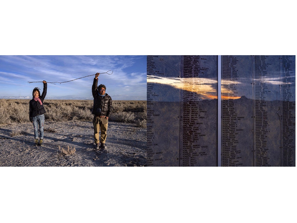 It was during my second pilgrimage that I began to incorporate objects like barbed wire, which resonated deeply with my previous work concerning the U.S. military’s presence in Okinawa. Imagery such as the one with barbed wire stretched between my wife and me against a barren backdrop, serve to emphasize themes of resilience and defiance. These elements are crucial to reflecting the historical experiences of Japanese Americans during their incarceration. Through IF ・ NOW, I seek to engage with my Japanese American identity and historical memory, blending powerful symbols into landscapes that carry rich personal and collective narratives.