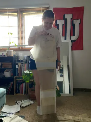 IU senior Jenna Reed stands with the pattern for Pacers player Aaron Nesmith's pants.Courtesy Jenna Reed