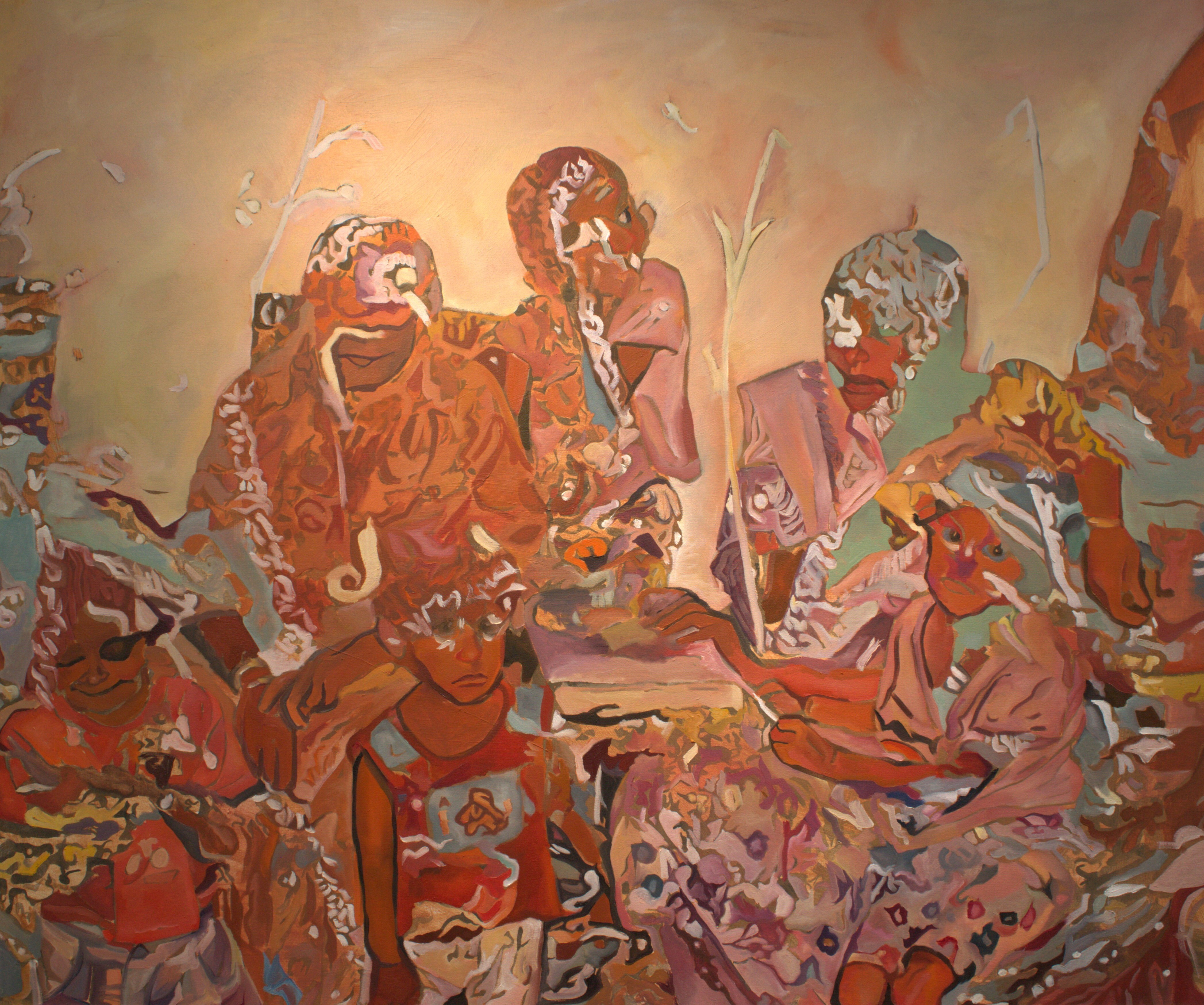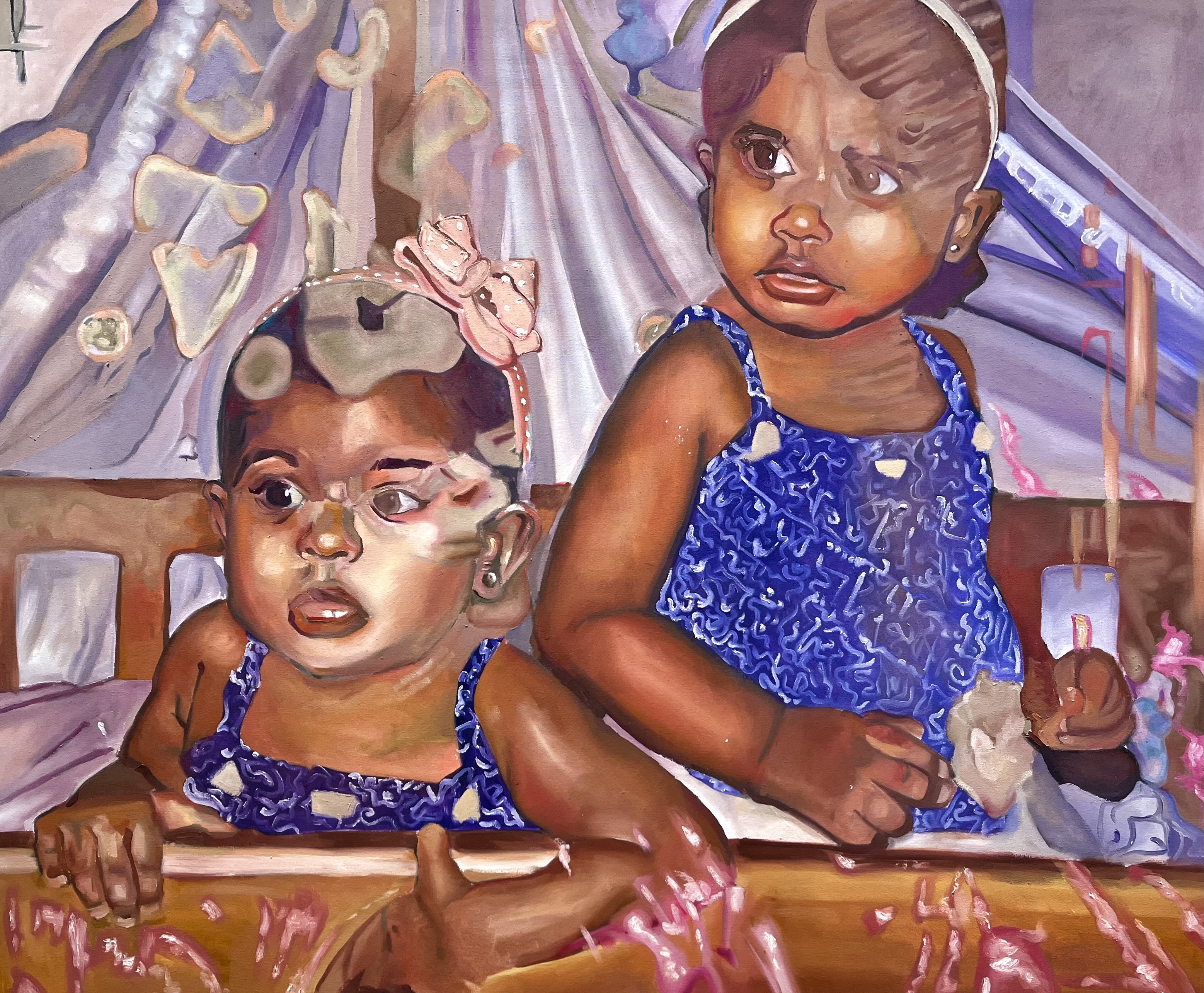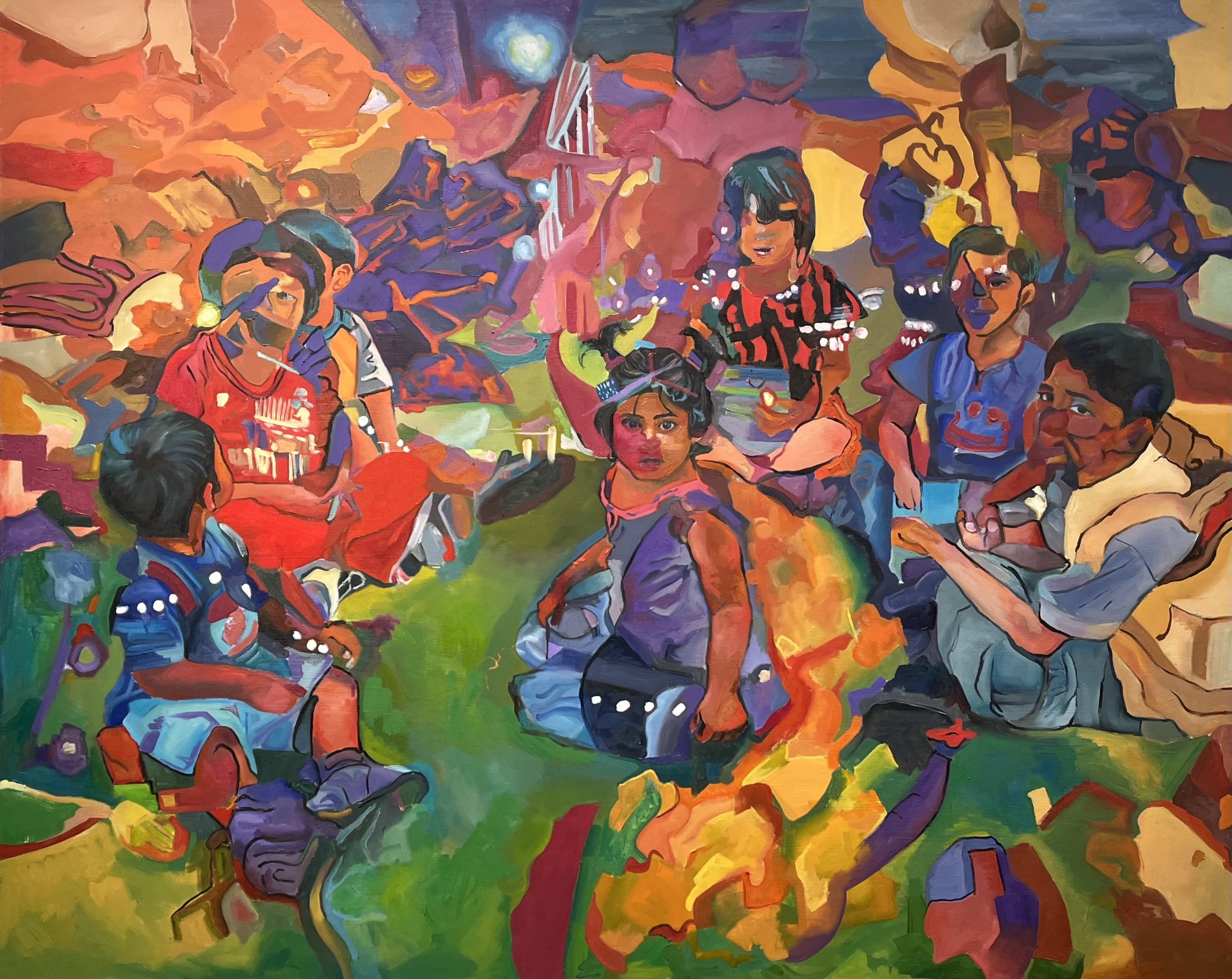 My name is Sarah Fazni, and I am pursuing a master's degree in arts administration at Indiana University. I received my BFA in Painting from IU [in 2024]. I love using oil and acrylic paints to explore nostalgia, form, and the complex relationship between figures and patterns. My artwork combines personal memories with present experiences, creating collages that focus on the connection between color, form, and memory. I am drawn to how patterns from clothing or objects connect me to people and evoke nostalgia, so I merge them with figures in my work. In my work, old photographs interact with newer ones, which bridges the past and present through shared environments and the figures within them.