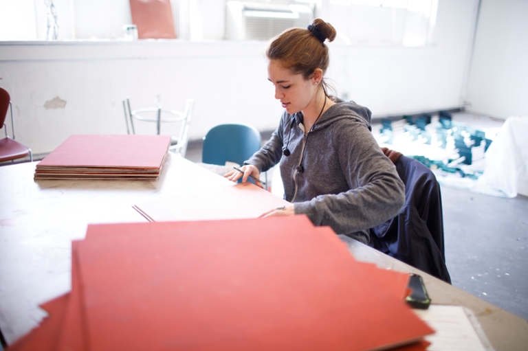 Kordi Schild, a senior BFA student in studio art with a minor in psychology, created a 7 1/2-foot-tall, 14-foot-long piece for the display. It will consist of an open-air hallway, a singular s-shaped wall with three consecutive entryways. One side of the wall will be surfaced with fabric and foam; the other side will be studded with pyramids made from wooden dowels and stretched plastic sheeting.