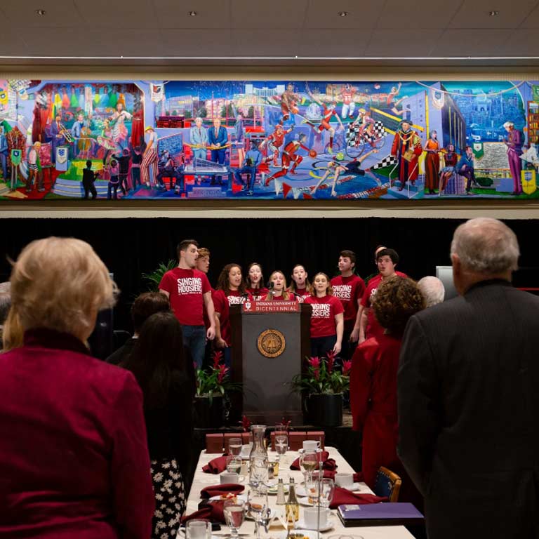 At the 200th Anniversary Dinner on Monday evening, a six-panel mural depicting the modern history of IU Bloomington was unveiled before about 500 invited guests.